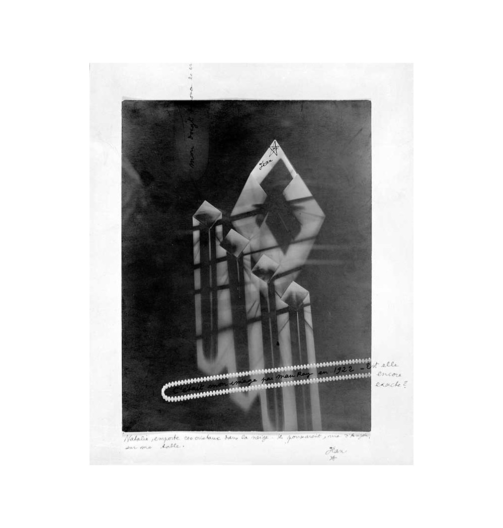 Rayographie avec poème et signature de Jean Cocteau au milieu: "C'était mon image par Man Ray en 1922 - Est-elle encore exacte?" en bas: "Natalie, emporte ces cristaux dans la neige. Ils pousseront, rue d'Anjou, sur ma table. Jean"