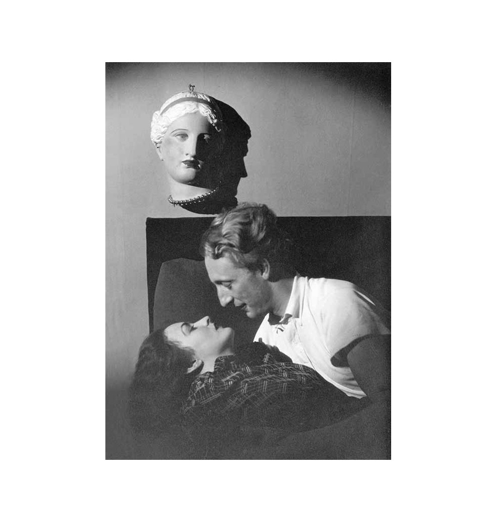A couple lays on a sofa in a kissing position under a mask hanging up on the wall.