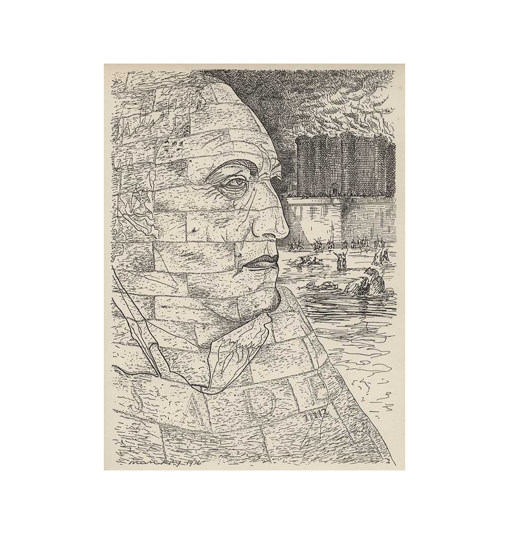 profile portrait of Sade, drawing for the book "Les Mains Libres", p.177