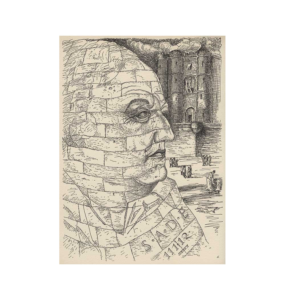 profile portrait of Sade, drawing for the book Les Mains Libres, p.174