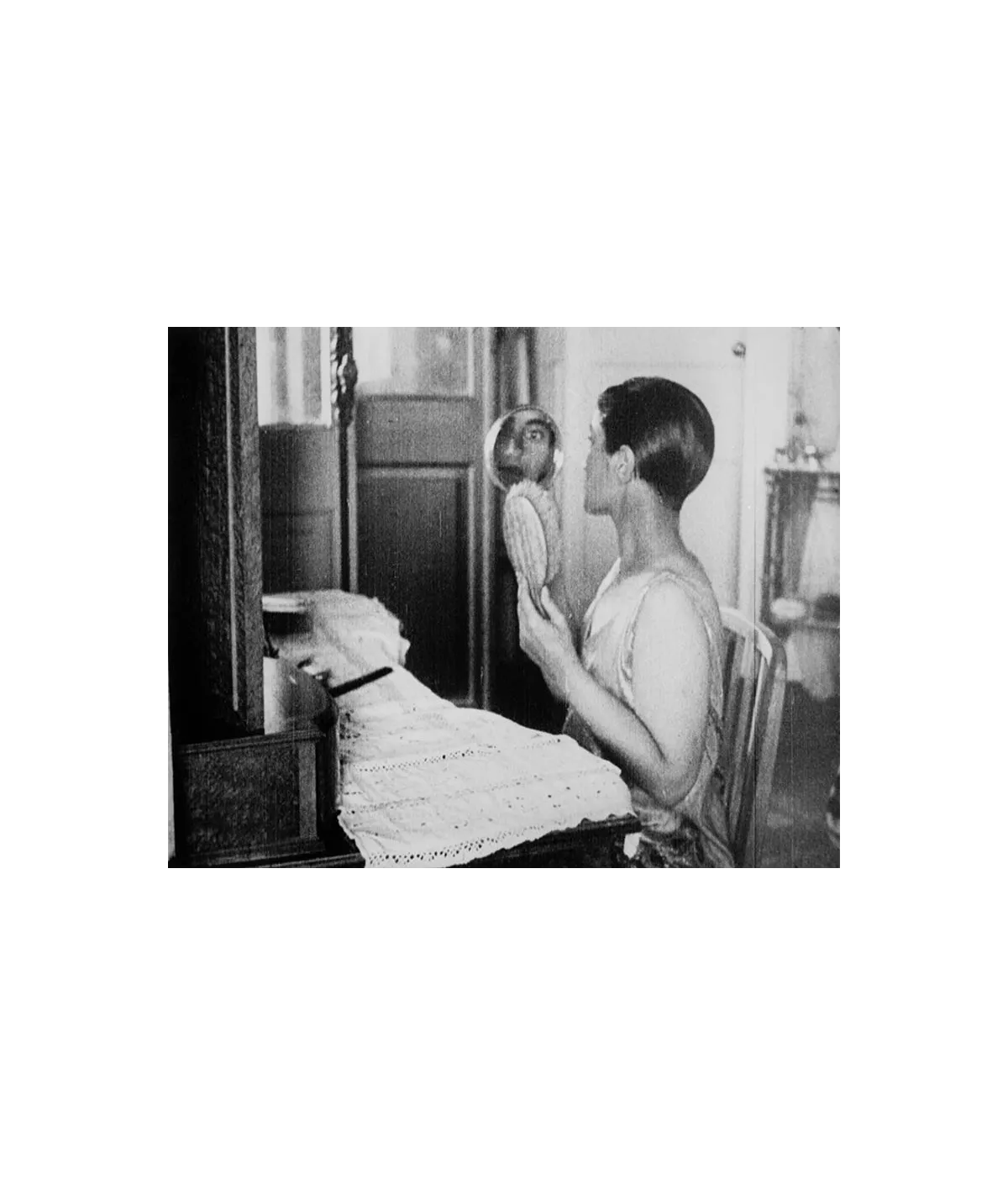 extract from Man Ray's movie woman looking at herself in a mirror she holds comb