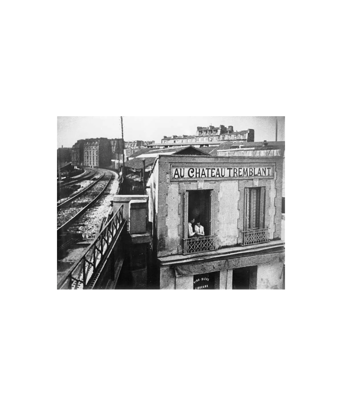 building frontage, near railway, couple at the window, inscription "Wine beer" on the window at the bottom