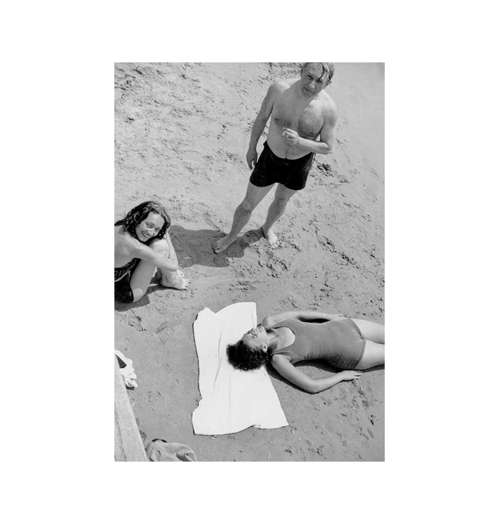 Pablo Picasso debout, Nusch Eluard assise et Cécile Eluard allongée sur la plage