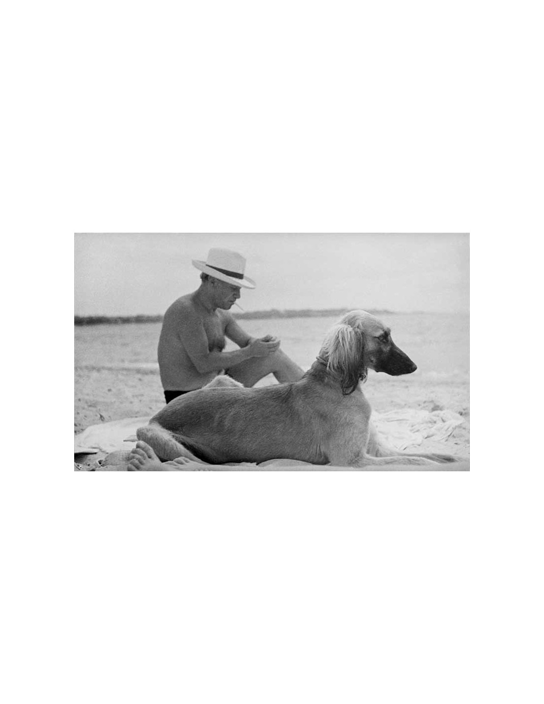 Pablo Picasso on the beach with his afghan dog, Kazbek