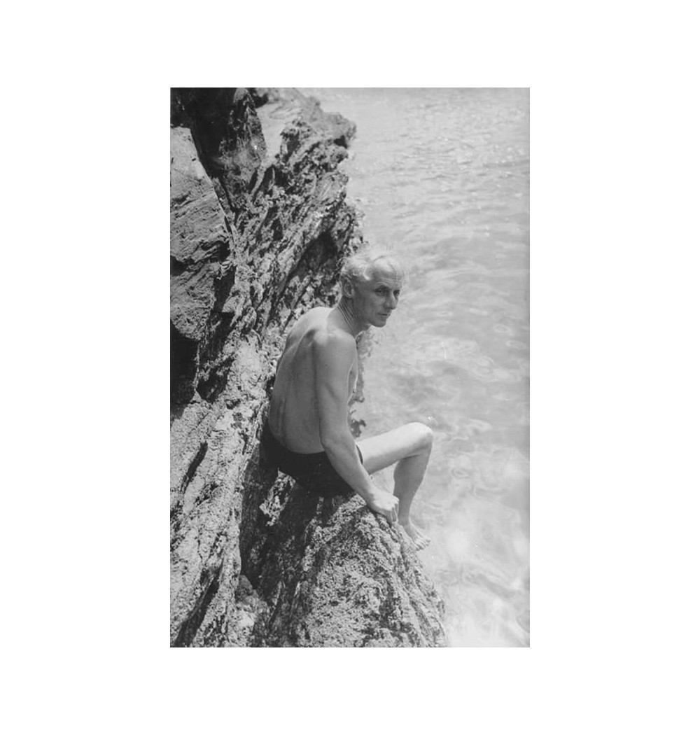In swimsuit sitting on a rock at the sea