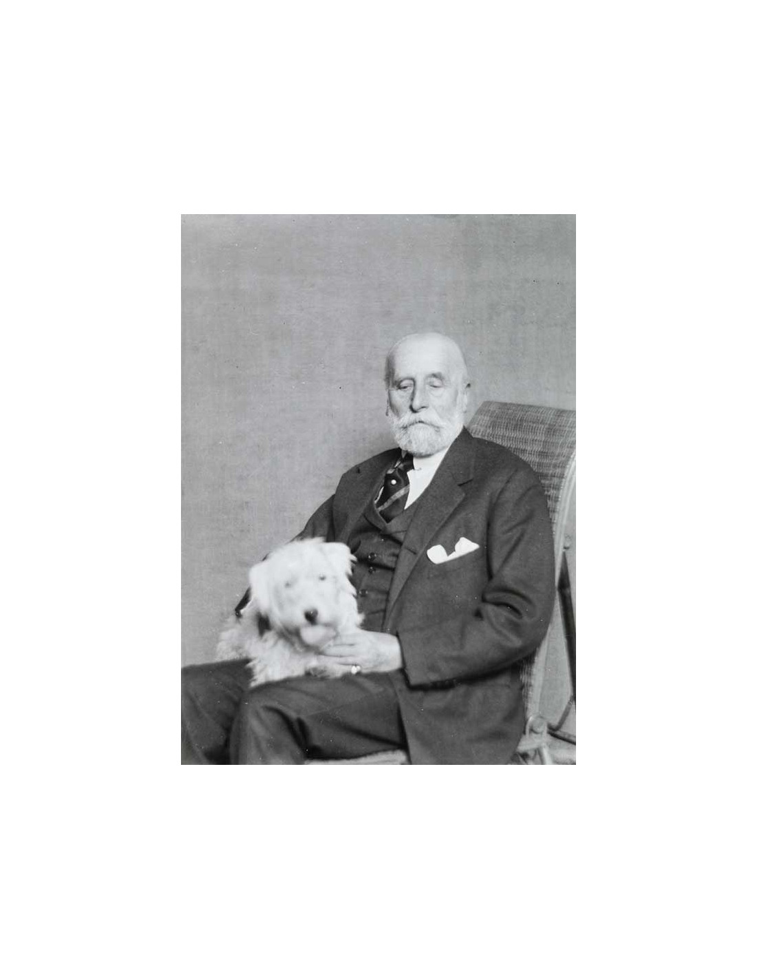 man sitting beard three-pieces suit with little white dog on his knees from the vest, light background