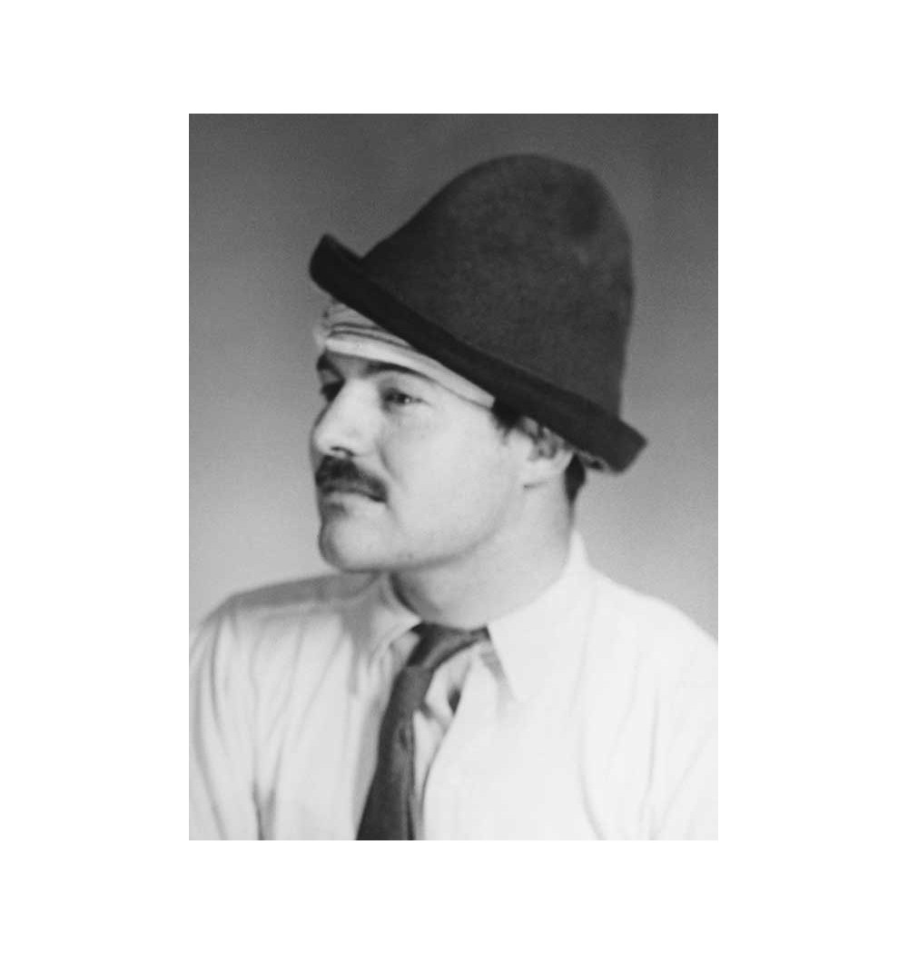 three-quaters portrait look on the right hat with binding up on forehead mustache white shirt dark tie Ernest Hemingway