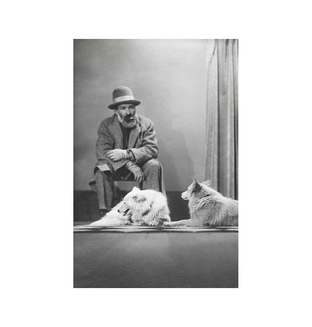 portrait Constantin Brancusi sitting a cigarette in the mouth one hand holding his fist hat two dogs