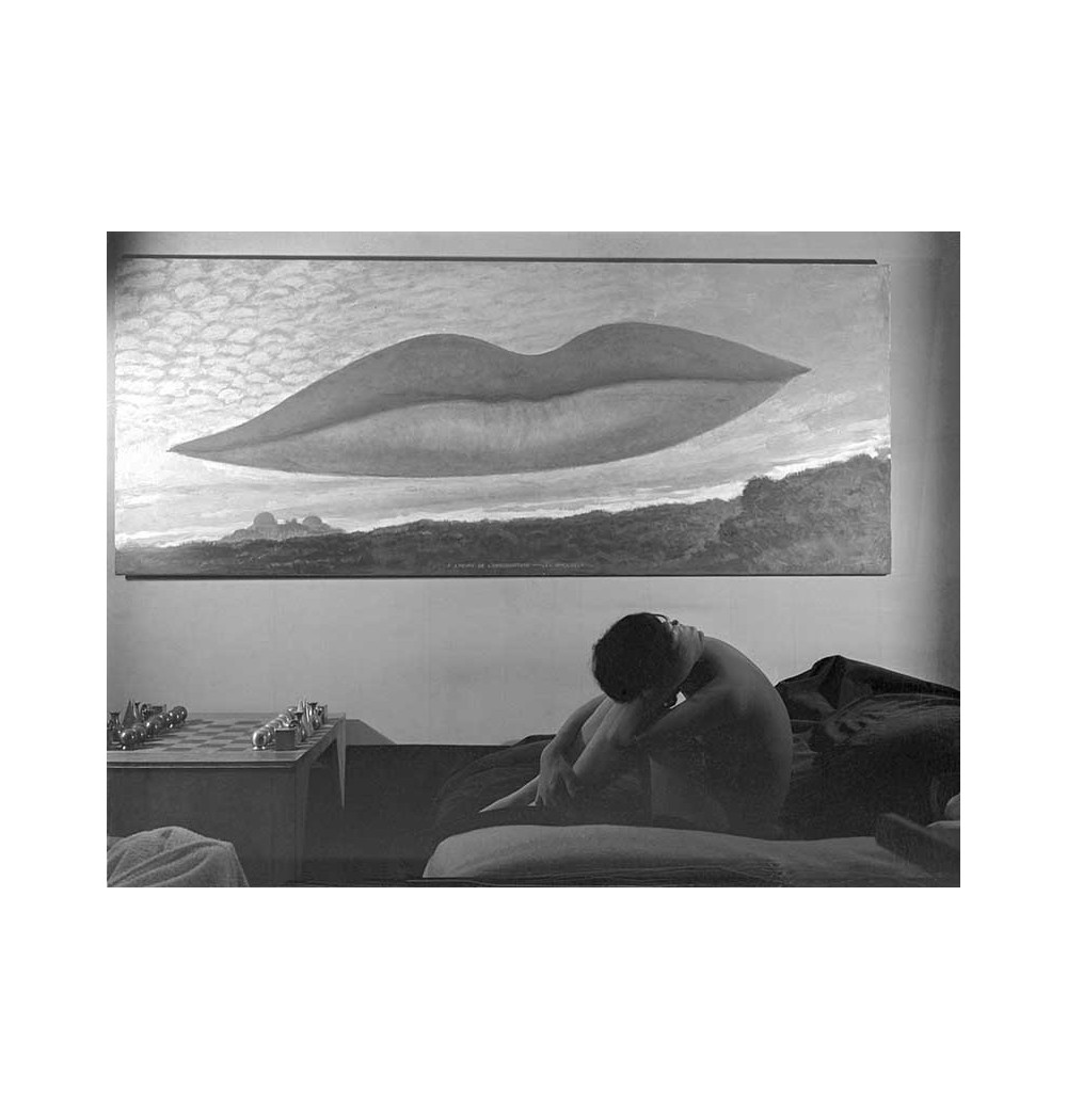 nude woman curled up on sofa under Man Ray's painting "A l'Heure de l'Observatoire, les Amoureux", with chessboard created by Man Ray