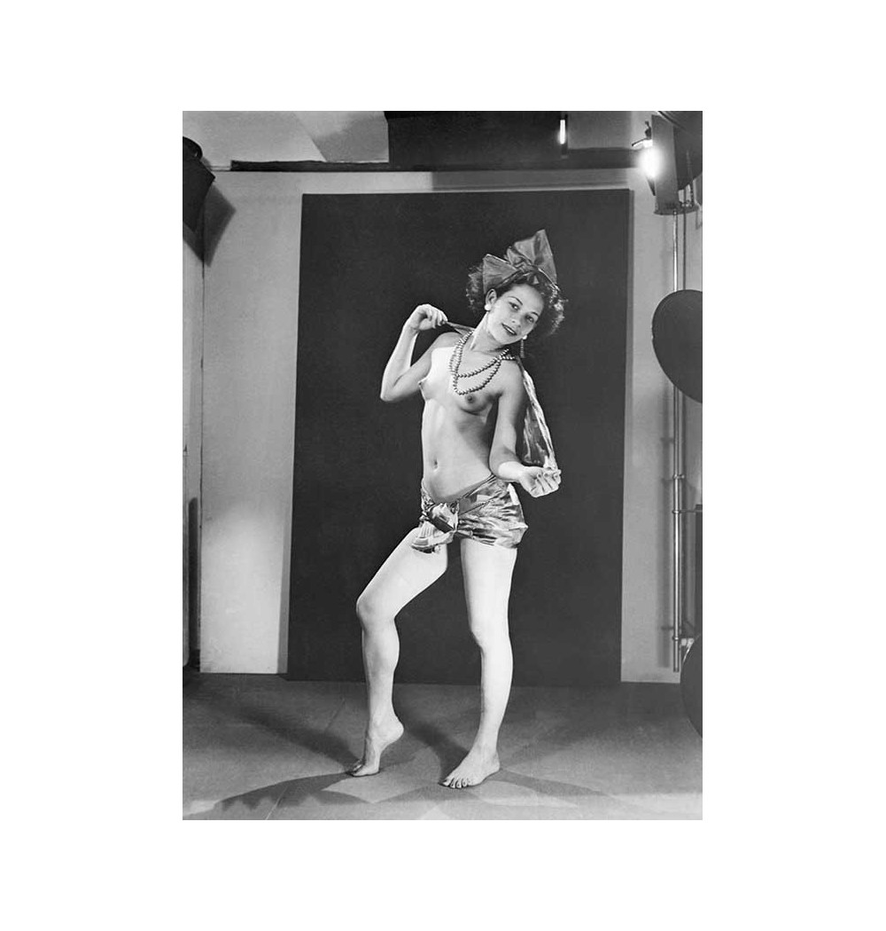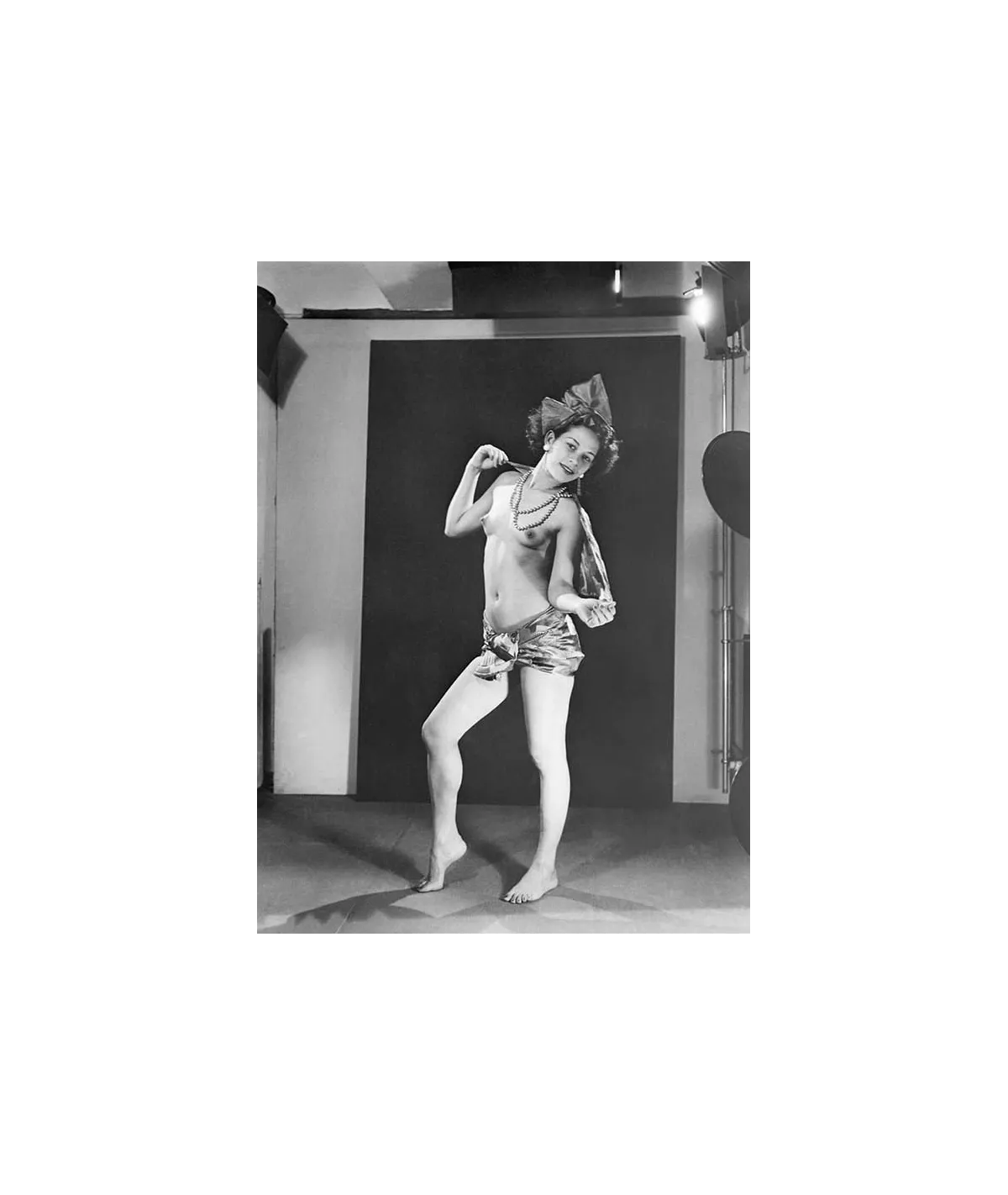 Adrienne Fidelin, nude in workshop photographs by Man Ray pearl necklace around the neck knot in hair ear-rings lamps headscarf limbs mouving as if dancing