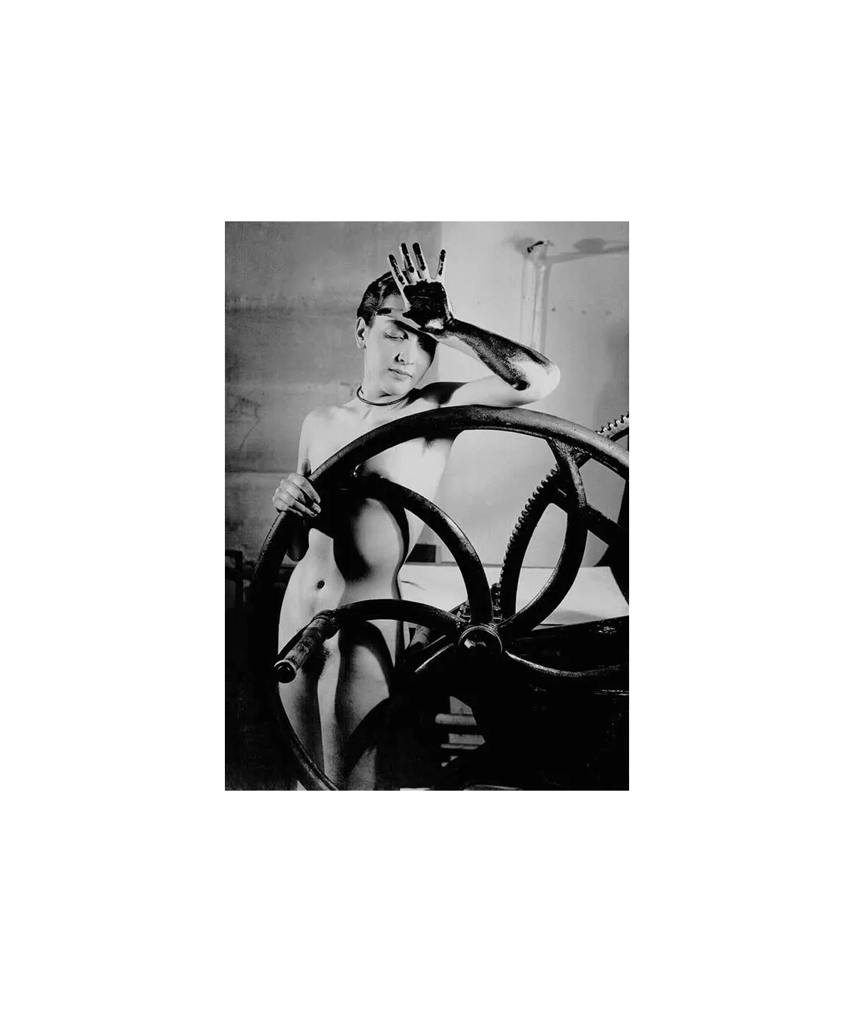Meret Oppenheim nude behind a press blackened forearm hand on forehead