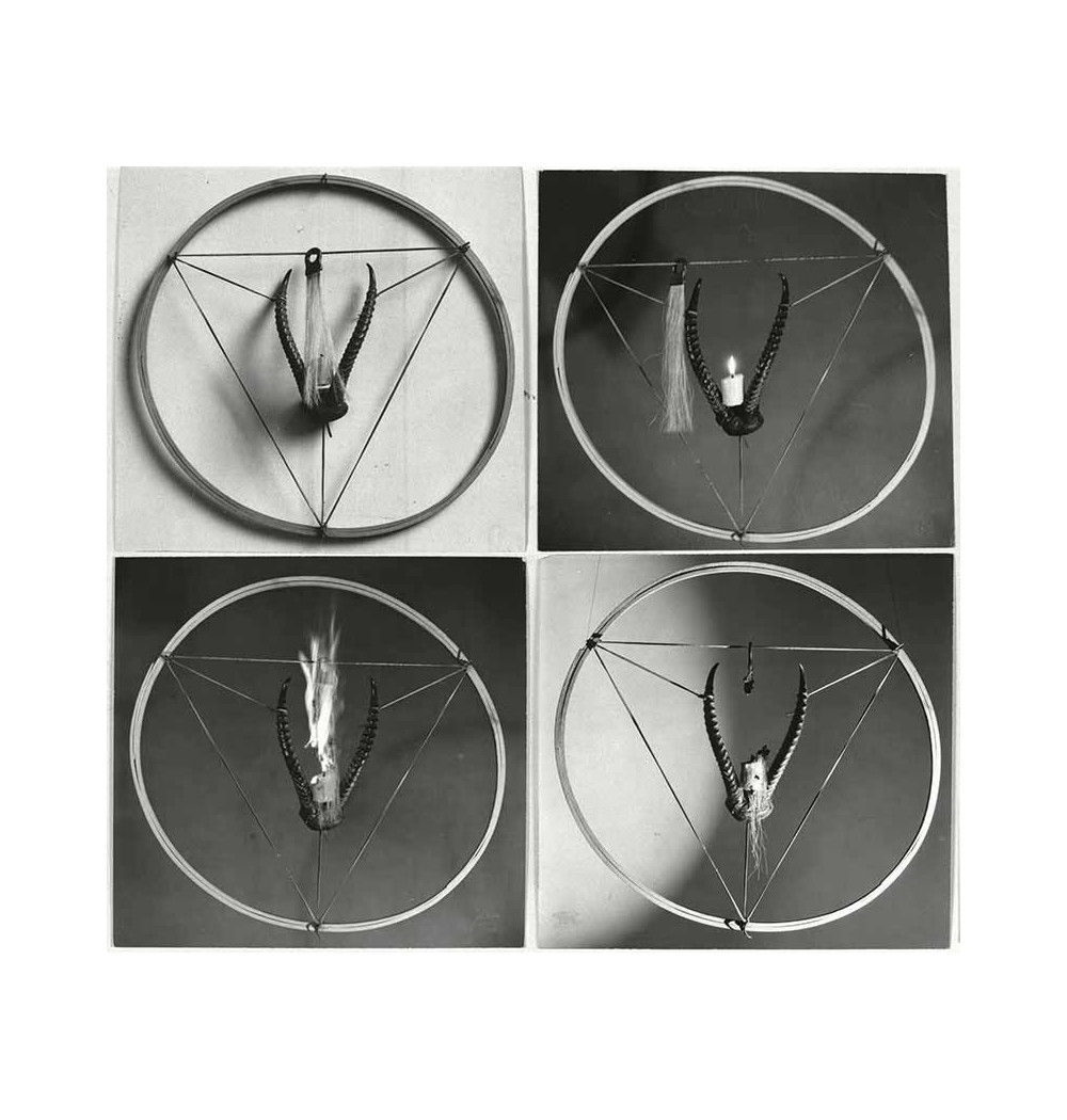 object - In a circle of wood hang a pair of horns and horsehair. A candle is lit and burns.