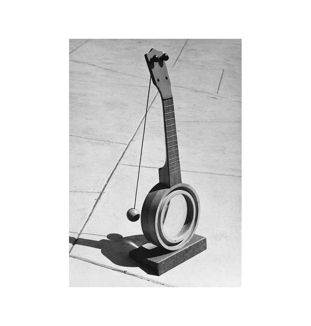 guitar neck stringed instrument on magnifying lenz with sphere hanging pendulum
