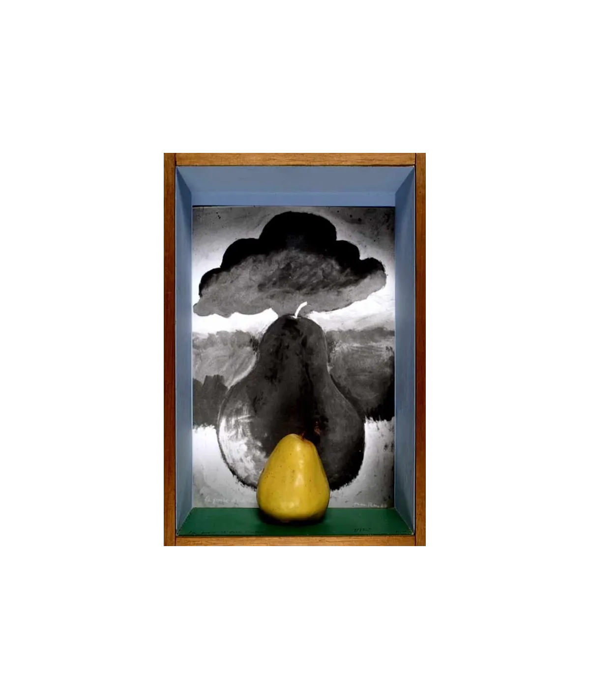 object - painted box containing a synthetic pear in front of a black and white photograph of your painting The Pear