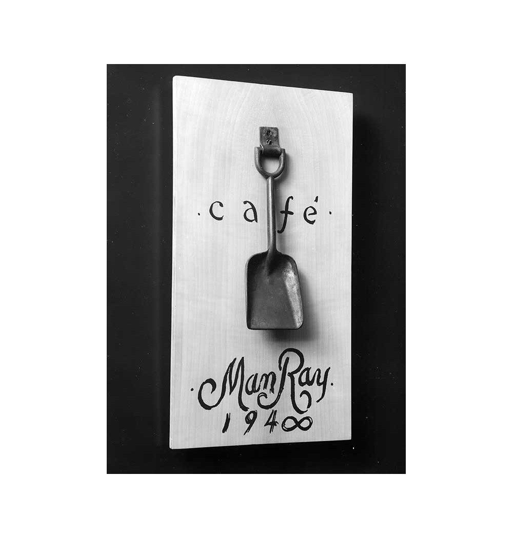 A small shovel for children on a panel, acting as a door knocker for an exhibition in a gallery