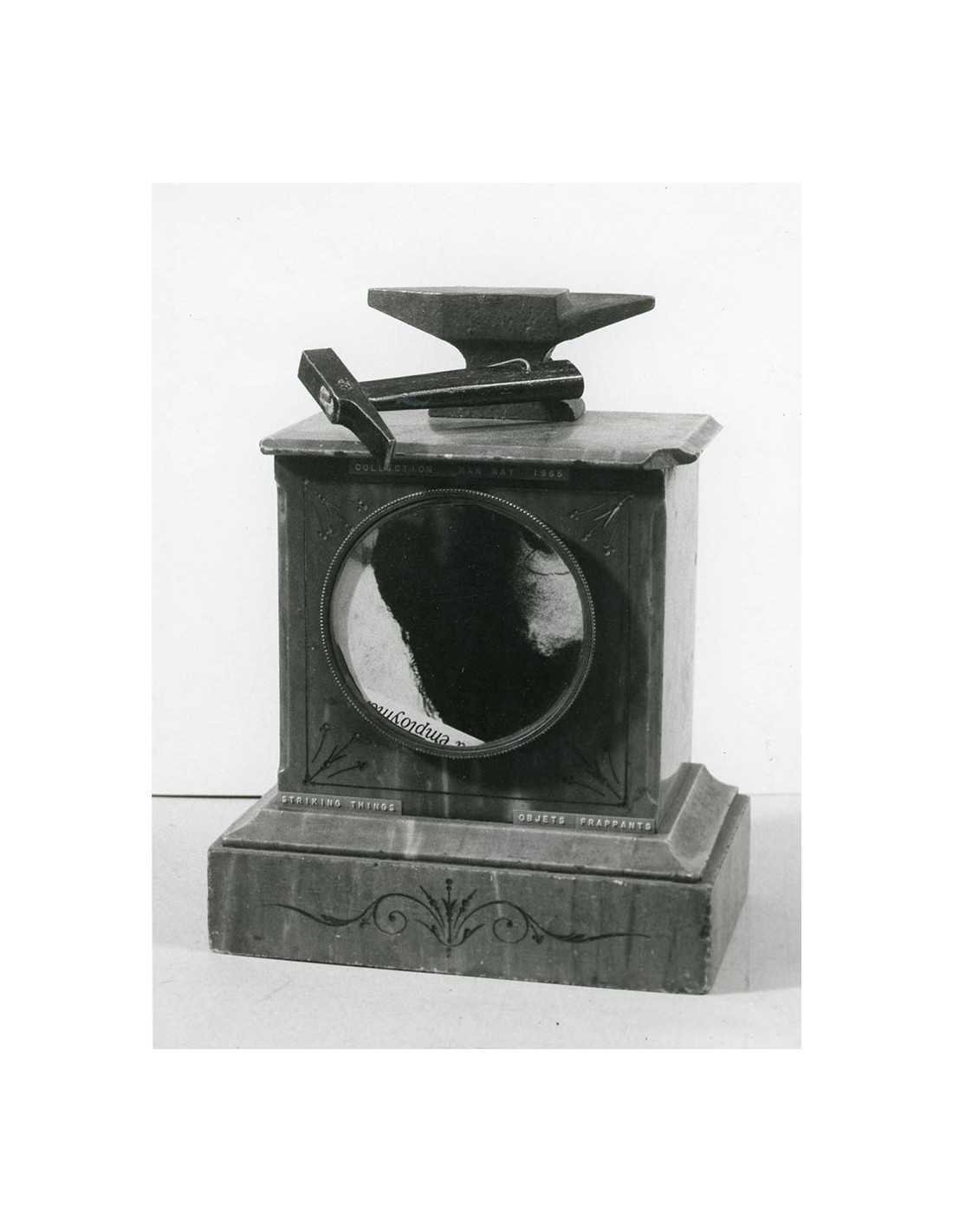 Iron (small anvil, hammer), marble slab, wood and circular reproduction under glass