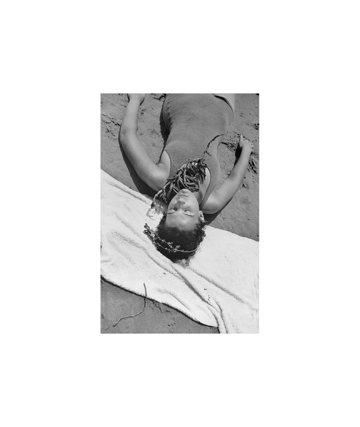 woman lying on the beach in Mougins swimming suit eyes closed high angle shot algas around the neck