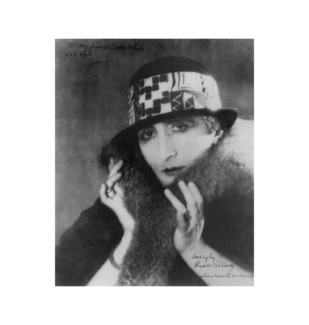 dedication dated 1924 by Man Ray at the top, Rrose Sélavy alias Marcel Duchamp at the bottomMarcel Duchamp transvestite as Rrose Selavy portrait with hat, both hands holding a fur collar