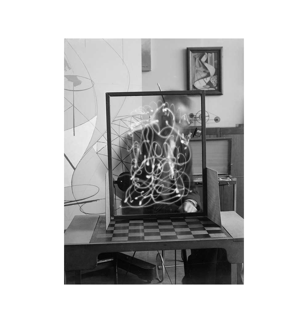 pose with writings by light in a glass frame person blurred close-up "On promène une lampe de poche allumée devant une pellicule exposée dans un appareil photographique" "You make a torch move in front of an exposed film in a camera" - large size in his studio with objects and paintings
