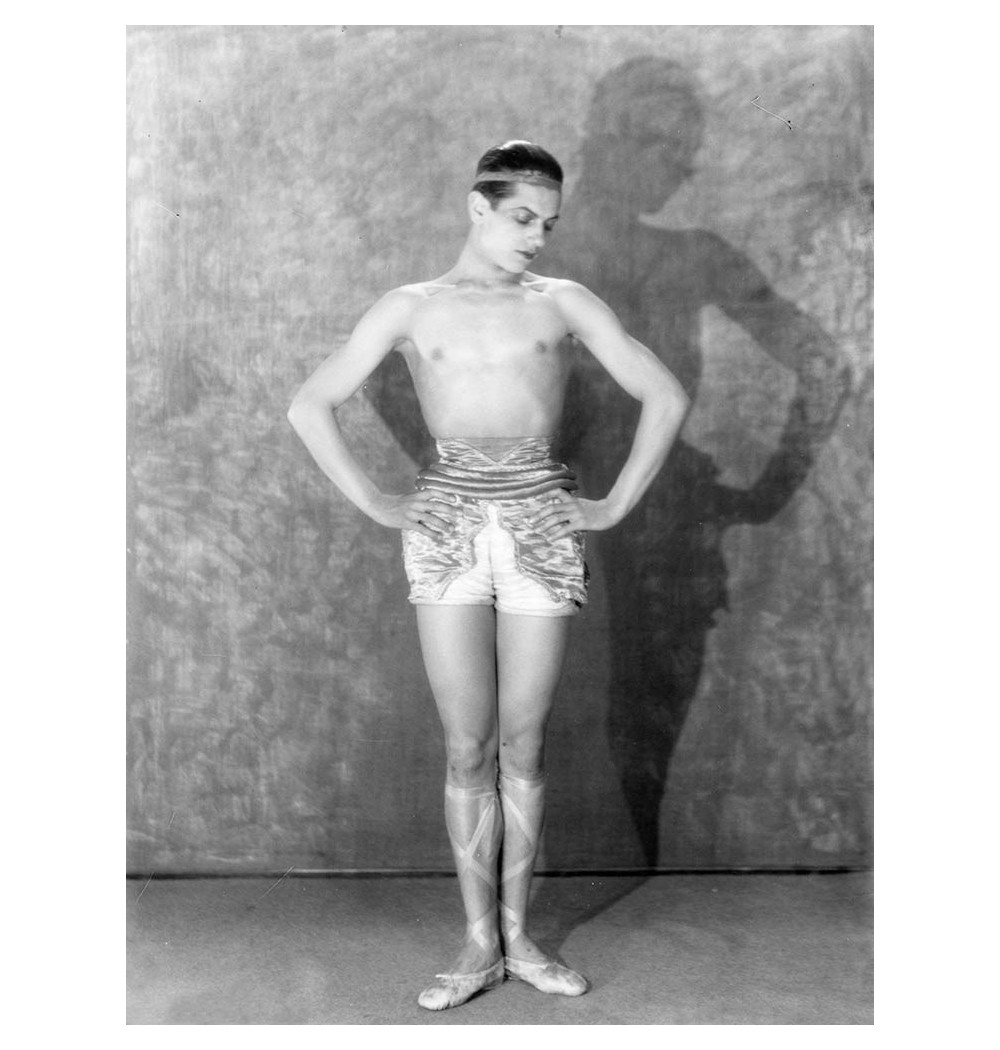 dancer (Ballets Russes) in a square position with arms in movementhat wearing shorts profile