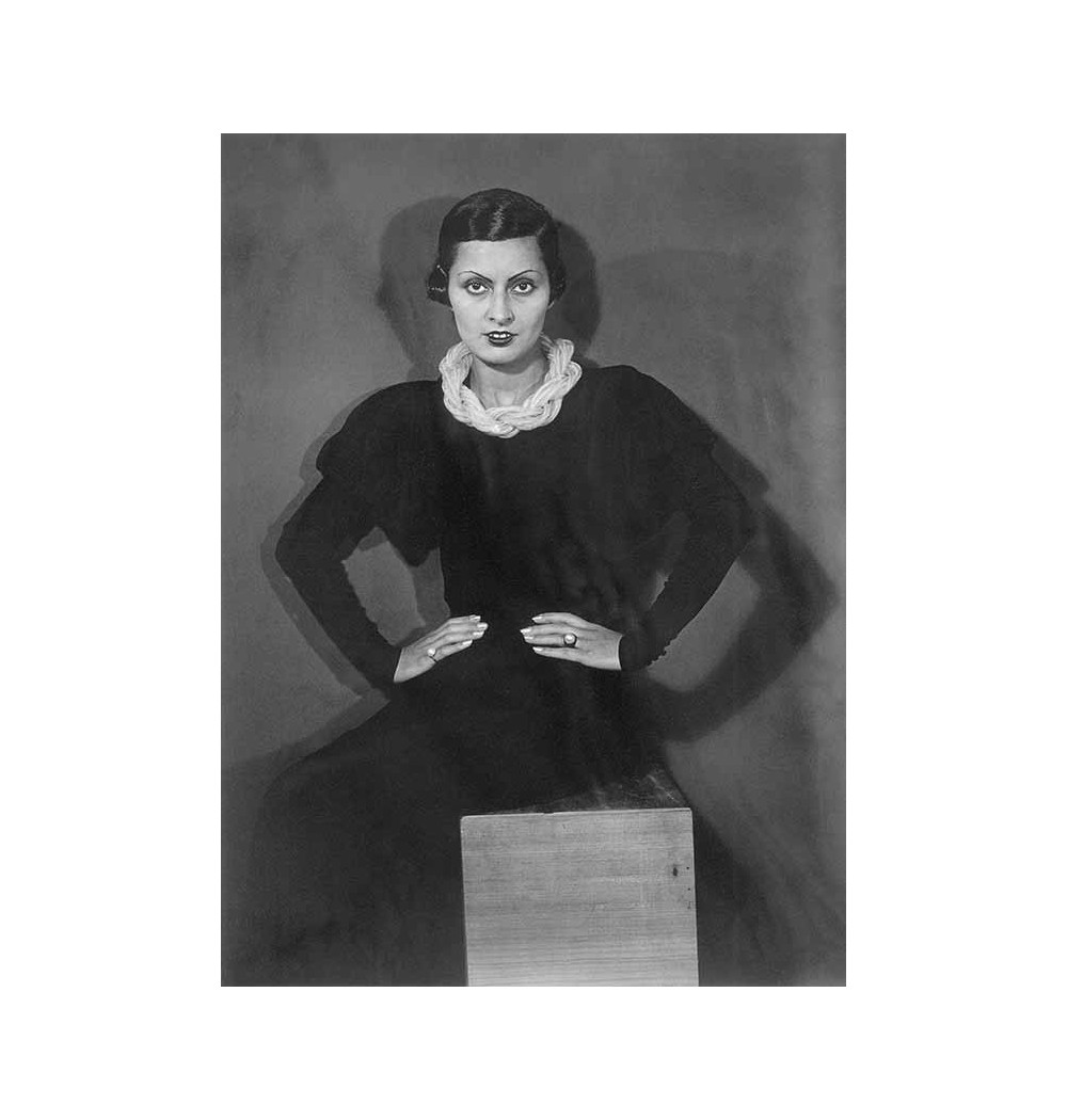 portrait woman sitting on wooden crate twisted white collar hands on hips