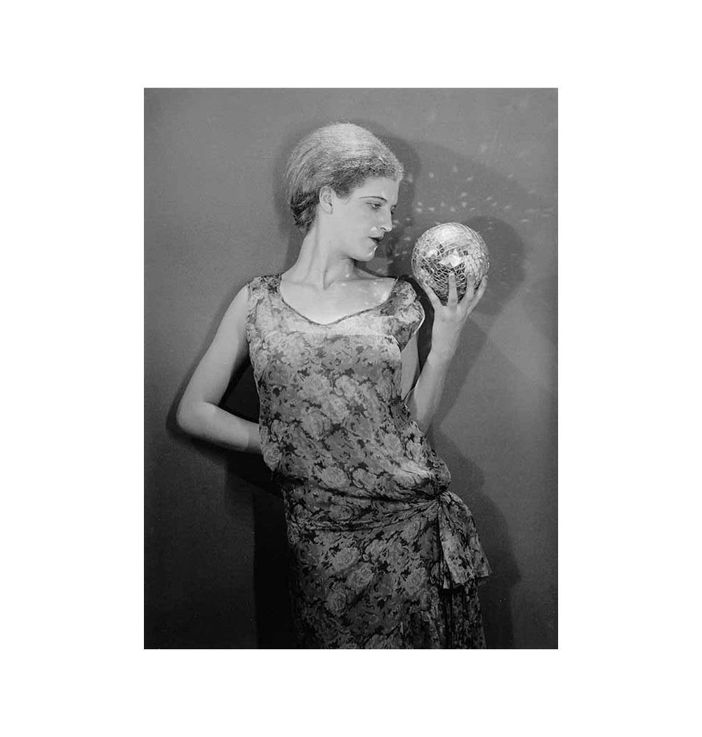 portrait of a bust-length woman with makeup, a disco ball in her left hand, floral dress
