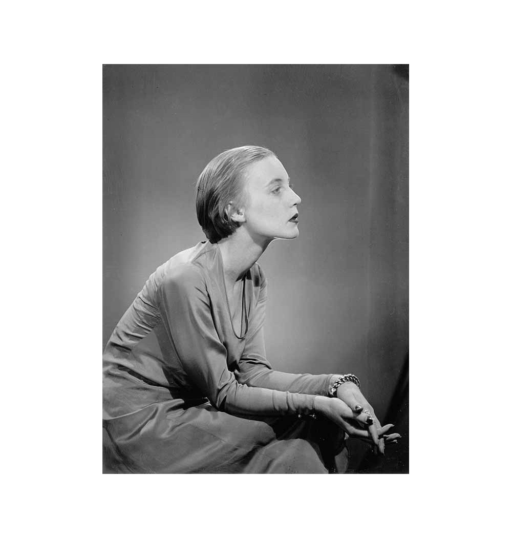 portrait of woman in profile, slicked back hair, makeup, hands crossed, jewelry