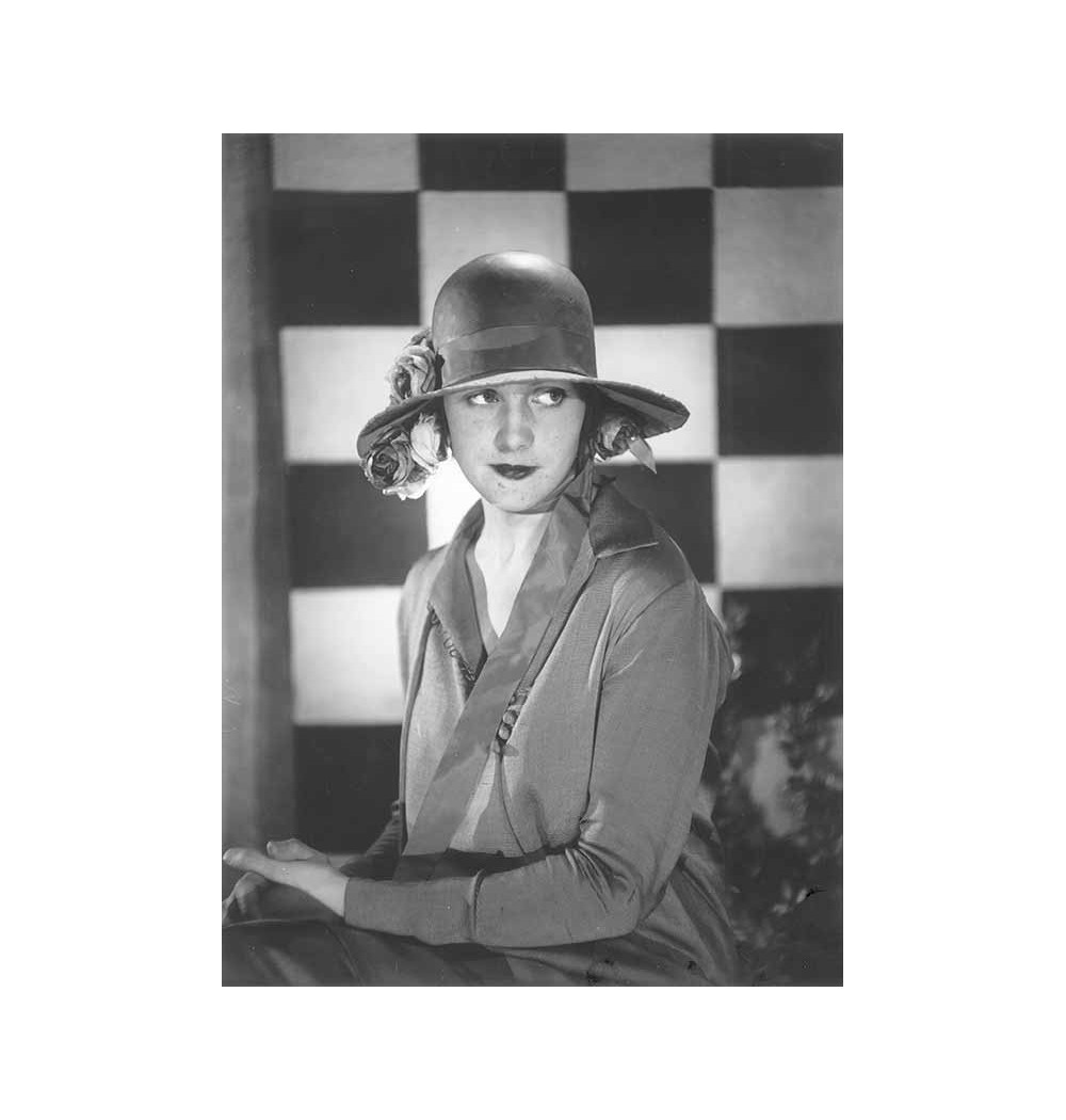 portrait woman sitting in profile hands crossed hat - checkered background