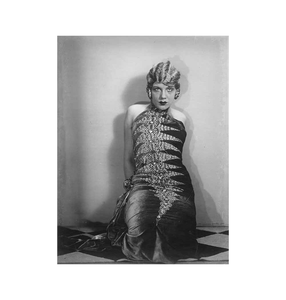 portrait woman sitting on her knees hands behind her back embroidered dress - light background