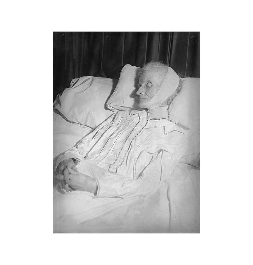 unidentified elderly woman lying on her bed with a headband around her head, hands crossed, eyes closed