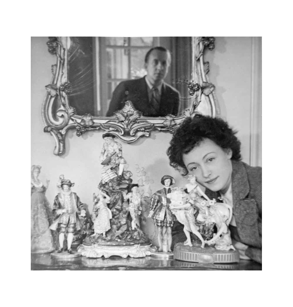 Nusch Eluard leaning on a console covered with figurines, Paul reflected in the mirror