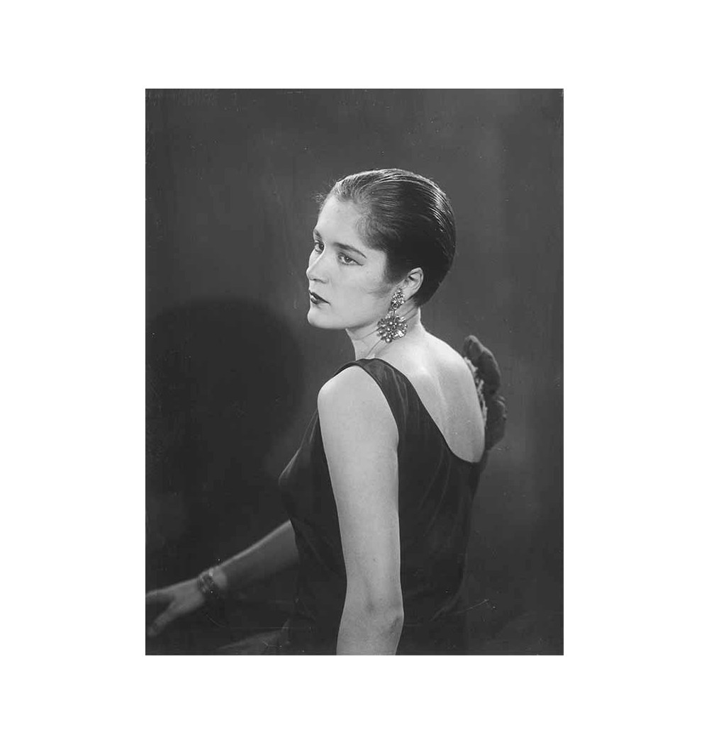 portrait of a woman with hair sitting 3/4 back, slicked back hair, dress with a neckline in the back, bust shot