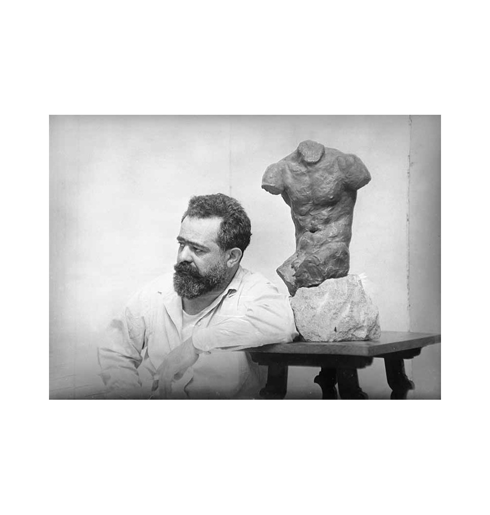 portrait of bearded sculptor leaning on his sculpture "Male torso" placed on a stelle