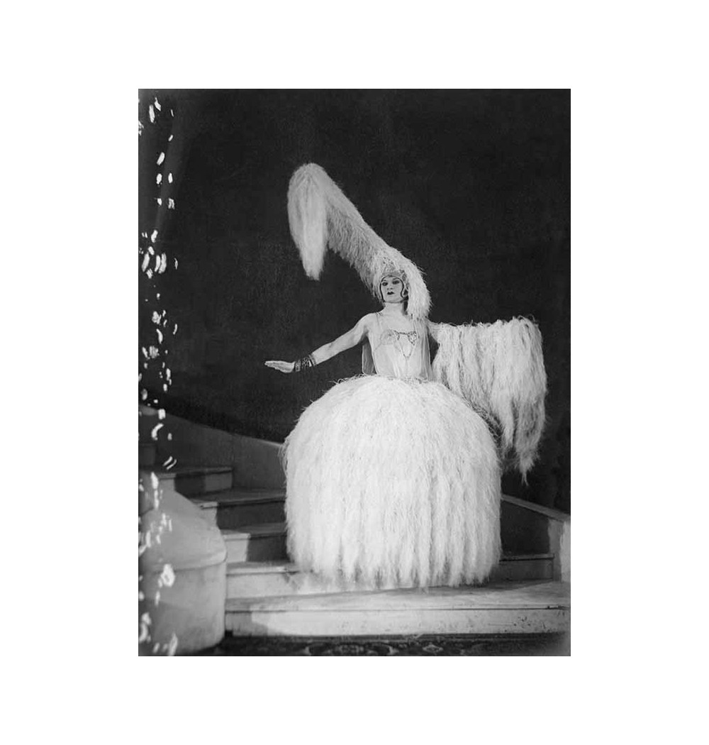 man travestatite facing in his feathers dress walking down the stairs arm opened highhead-dress with feathers