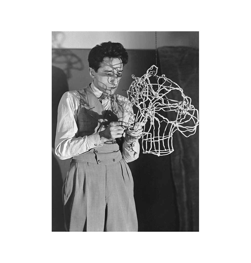 bust portrait of a man working on a mobile made of white iron wire, head as a pipe remover from “Sang d'un poète” - writer