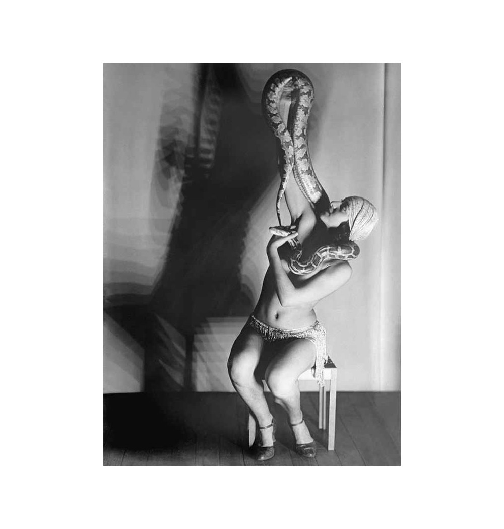 snake charmer, shirtless, seated lifting the snake above her head
