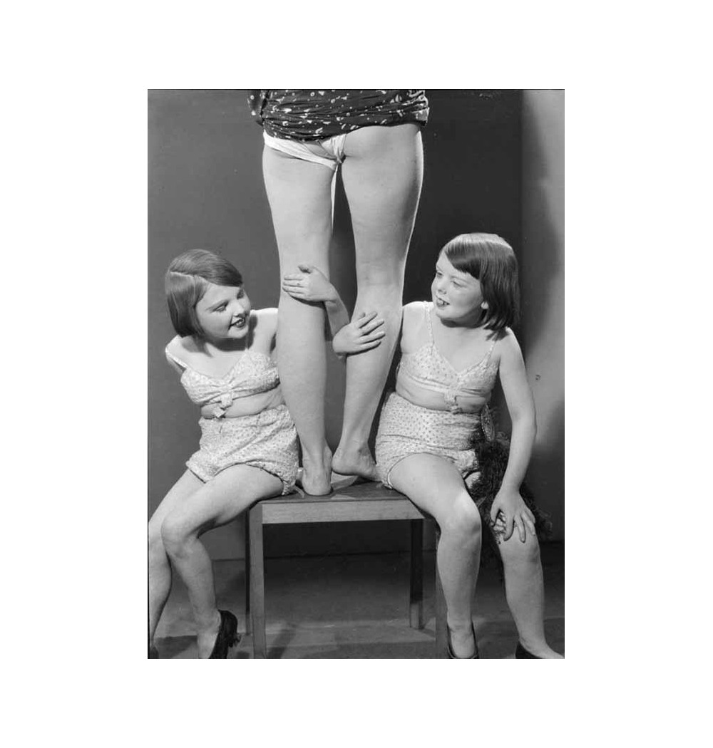 Lee Miller's legs and thighs on little table two dwarf children smiling holding one leg