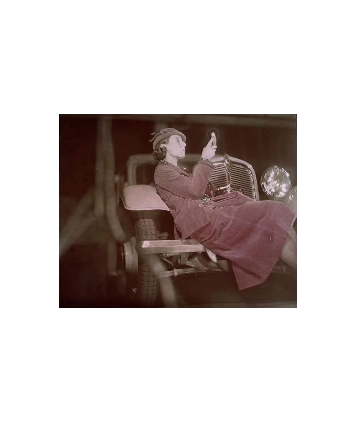 portrait of woman sitting on car bumper - color - Advertising for the Automobile and Radio Show of 1933