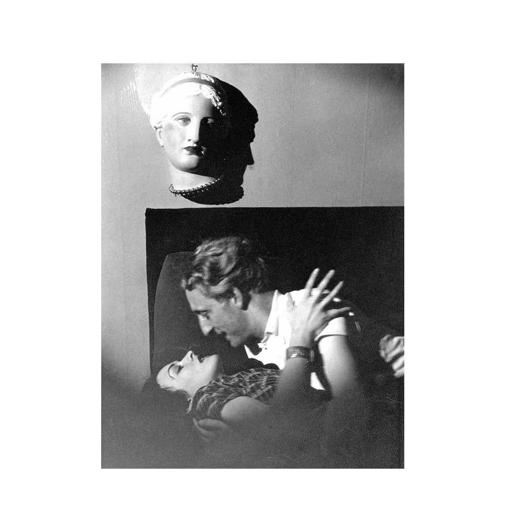 A couple lays on a sofa in a kissing position under a mask Venus hanging up on the wall.