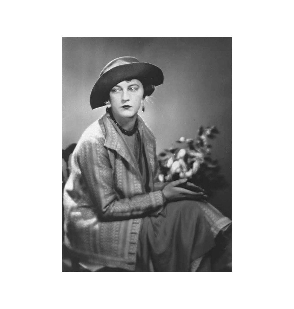 model woman sitting in profile wearing hat and striped jacket, necklace and dangling earrings