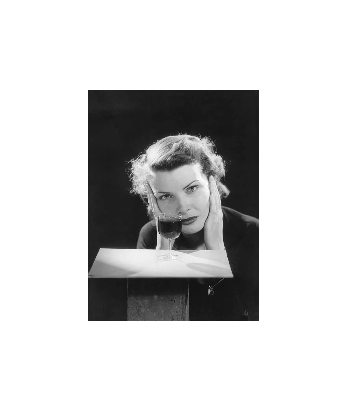 Mary Gill−Einstein, portrait woman facing head in hands glass of wine in front of her face sad looks backlighting black background