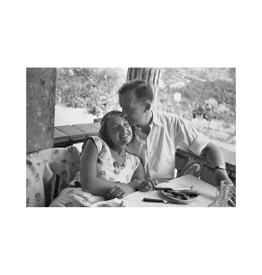 man kissing his daughter sitting toghether around a table in Mougins view on the garden