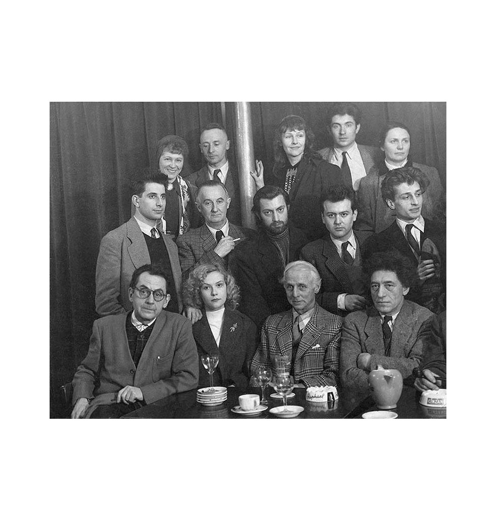 Surrealiste Group, 1953: Man Ray, Maryse Z, Max Ernst, Alberto Giacometti.second line: Michel Zimbacca, Clovis Trouille, Andralis J-L, Bédouin, J-P Dupreythird line: Suzanne Cordonnier, Julien Gracq, Elisa Breton, José Pierre, Sarah L.