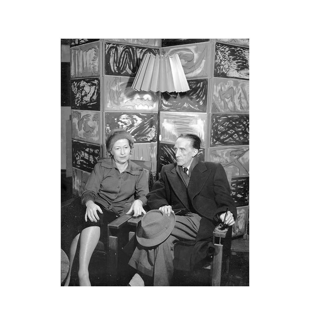 Marcel Duchamp and Tenny, sitting in front of folding-screen "20 jours et nuits de Juliet" Juliet's 20 days and nights