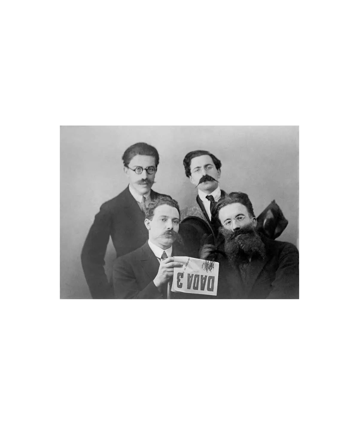disguised group with wigs and mustaches holding DADA 3 poster in hand