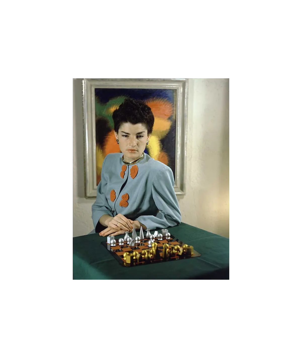 profile portrait of woman in front of a chessboard painting by Man Ray on the wall"Absence of white", Californie blue dress colour photograph