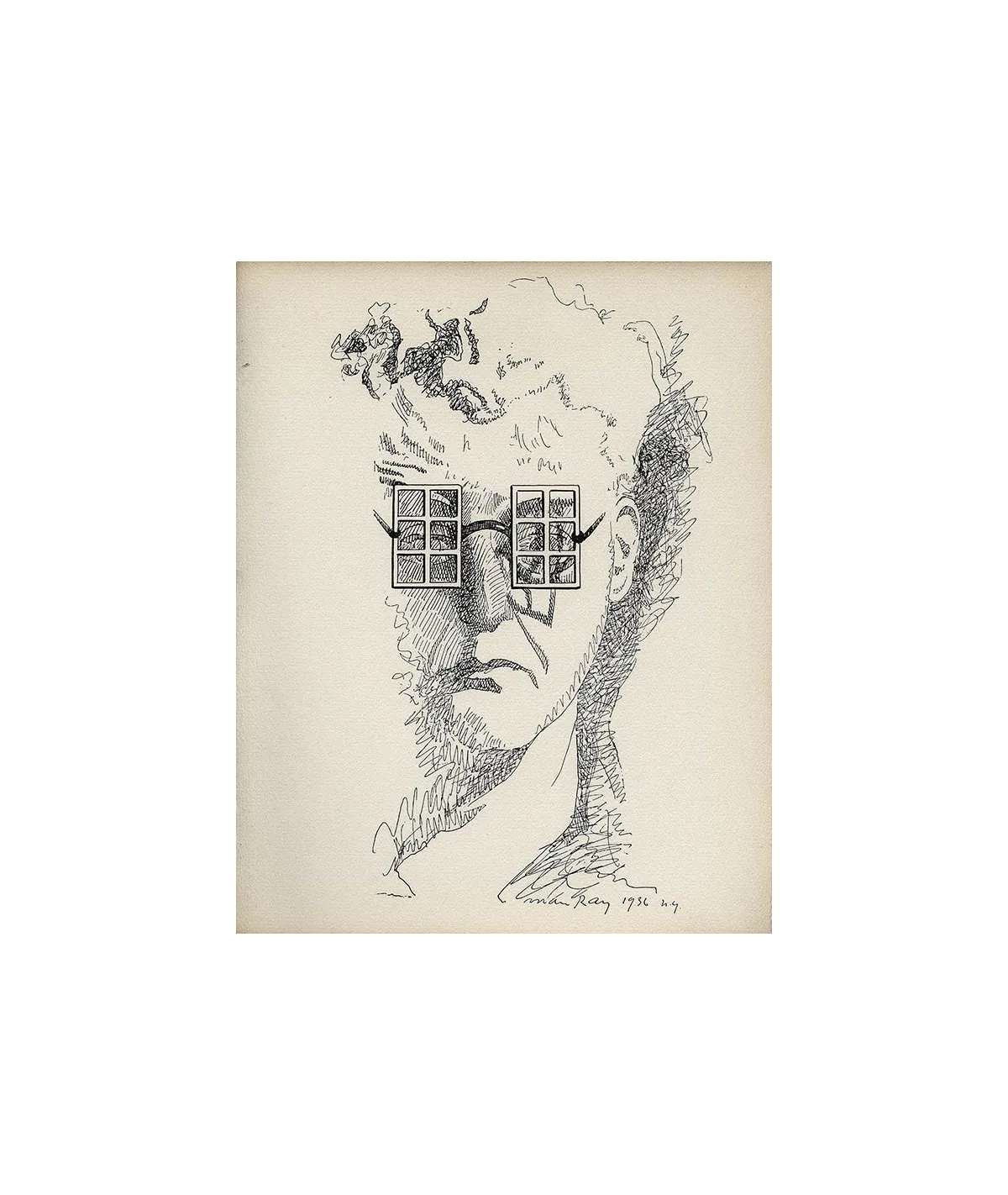 drawing by Man Ray selfportrait window-like glasses on eyes small squares on the eyes extract from Les Mains Libres