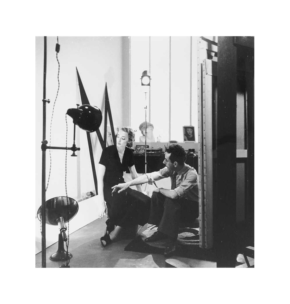 Man Ray sitting in workshop telling her model how to pose spotlight, photo by Roger Schall