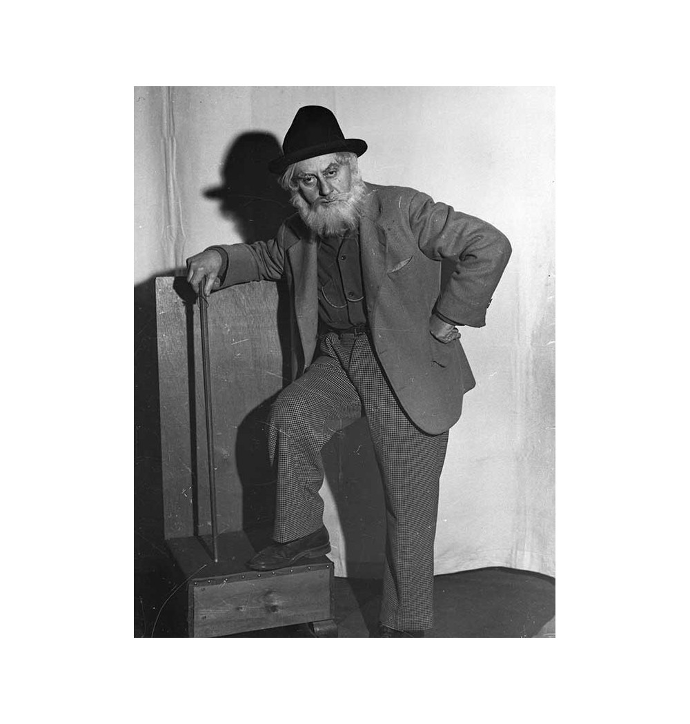disguised as Walt Whitman elderly person white beard hat foot and arm on wooden piece fo furniture
