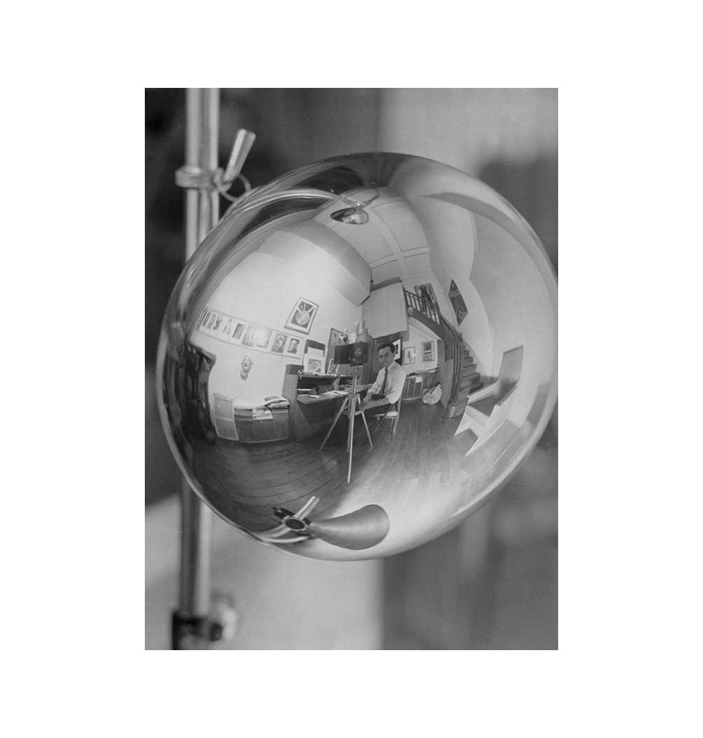 Man Ray man next to camera on tripod photograph reflected in ball studio